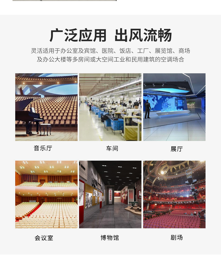 球形噴口的送風噴嘴為球形,卡在外殼中,配有鋁制裝飾圈和可直接為圓插接的圓形接管,噴嘴可在30度左右范圍內人工或電動調節。主要用于音樂廳、劇場、博物館、電影院、飛機場、高鐵站等空調送風與人員活動范圍有較大距離的環境中。