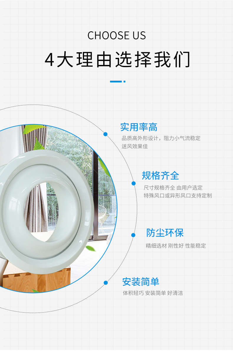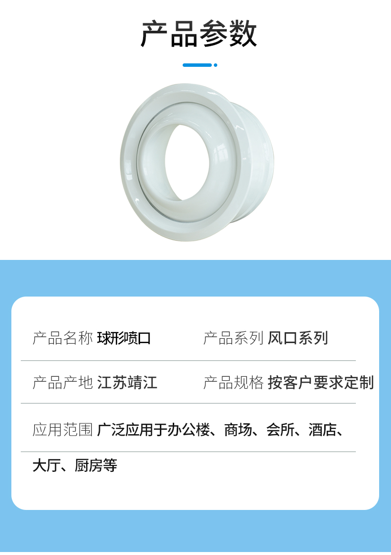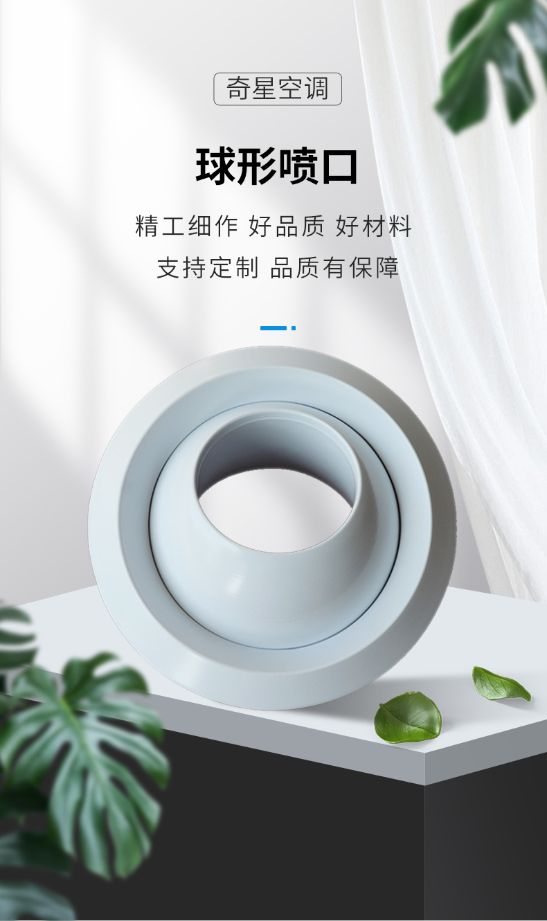 球形噴口的送風噴嘴為球形,卡在外殼中,配有鋁制裝飾圈和可直接為圓插接的圓形接管,噴嘴可在30度左右范圍內人工或電動調節。主要用于音樂廳、劇場、博物館、電影院、飛機場、高鐵站等空調送風與人員活動范圍有較大距離的環境中。